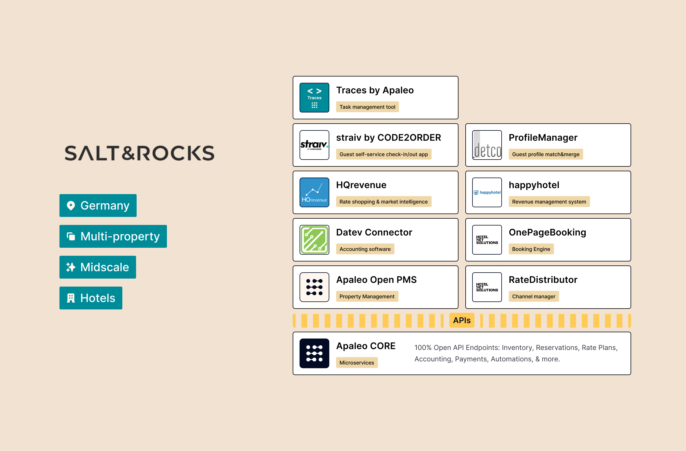 "Our owner-operator approach and a high level of digitization are the supporting pillars," explains CEO and hospitality expert Marc O. Benkert. The first projects emerged in the fall of 2019 on the North Sea and Baltic Sea. "The central platform approach of Apaleo and the high degree of digitalization bring us transparency and agility in the management of operational decisions in the houses." Result: since taking over the houses, sales have been rising steadily. "A first case that confirms our concept," says Benkert. "Salt & Rocks is not a hotel brand. We manage individual brands and houses that fit the region or a target group. Each property is different. Apaleo, as a highly flexible system, is our backbone."