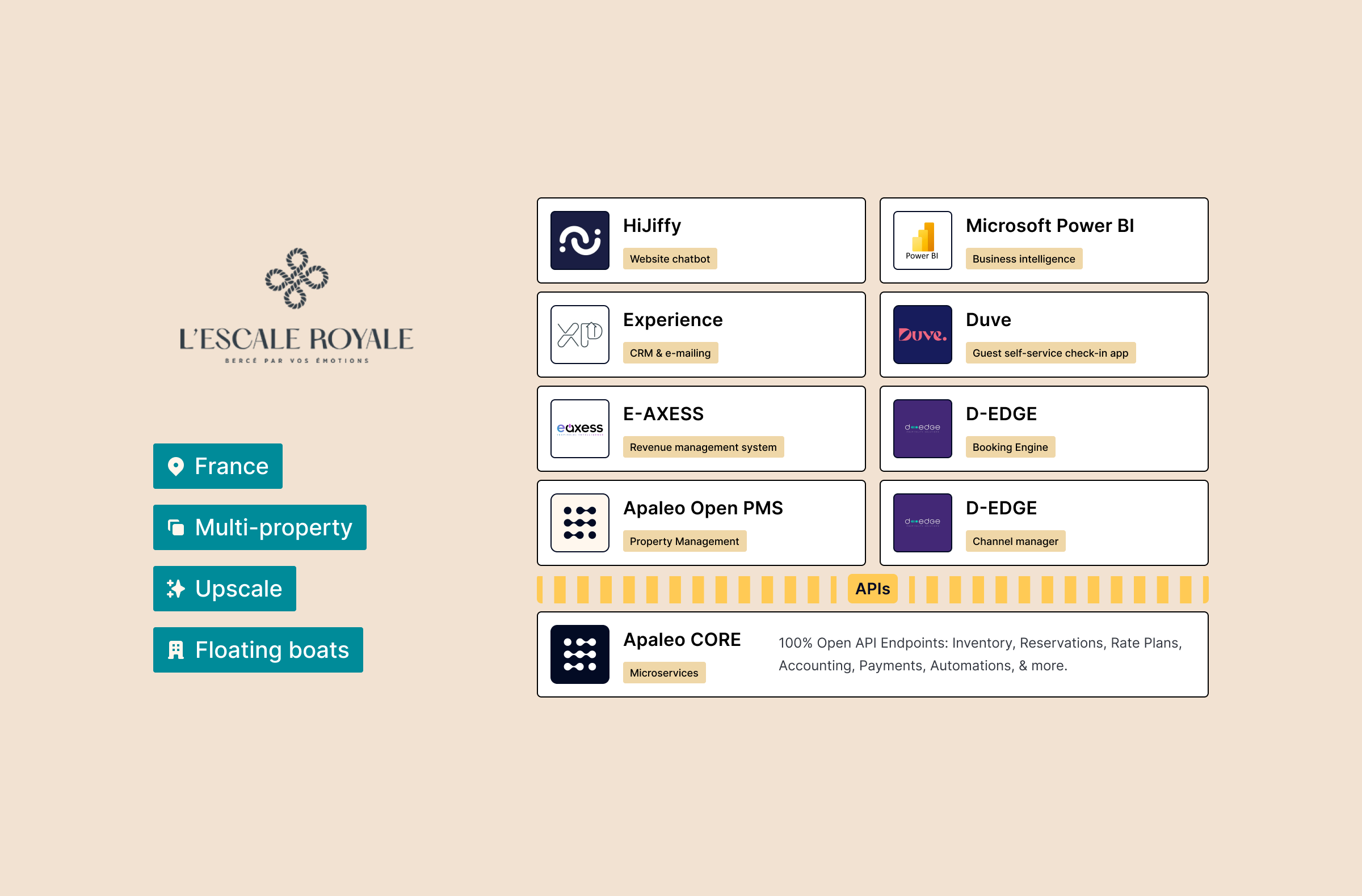 "Of all the solutions we've known, Apaleo and Topsys are one of the providers who listen most to their clients," shares Aurélien. Thanks to this collaborative approach and easy implementation, L'Escale Royale successfully migrated from its old system in less than a month.