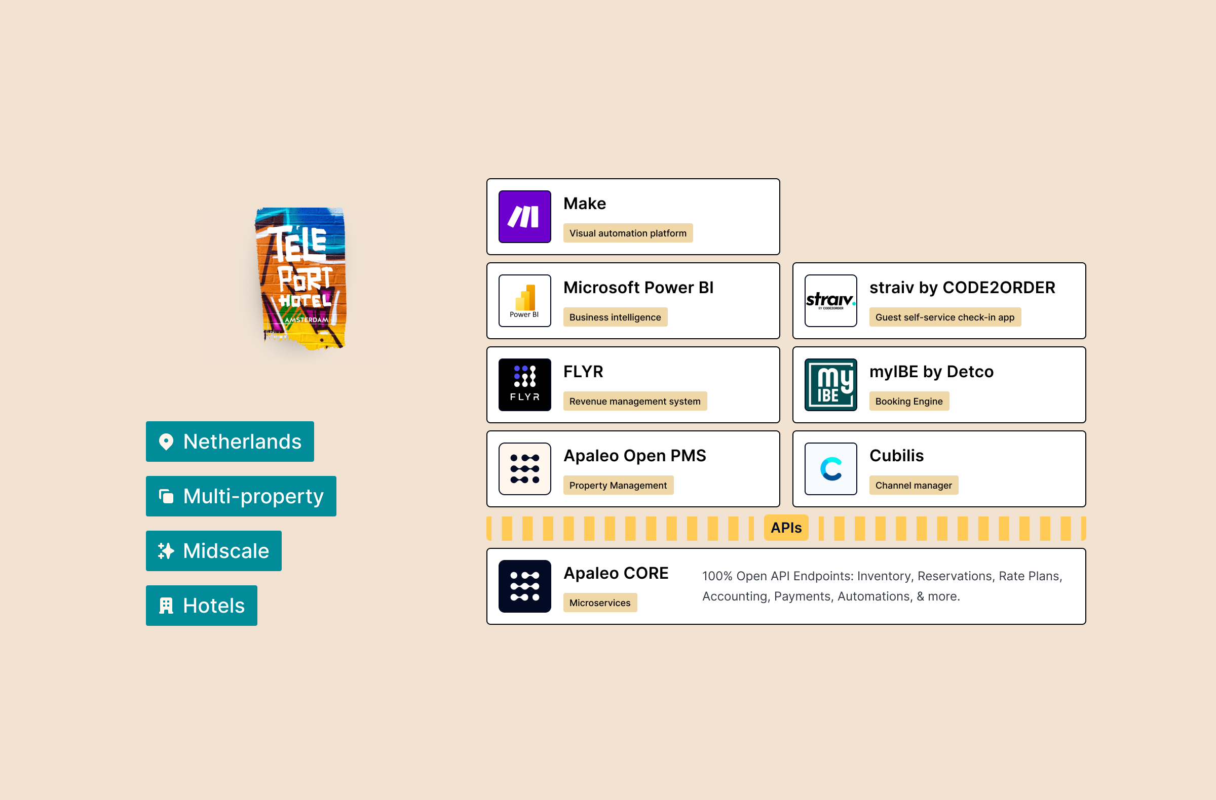 Teleport Hotels betonte die Notwendigkeit einer vollständigen Zahlungsautomatisierung, um das Potenzial menschlicher Fehler und die Notwendigkeit manueller Eingriffe zu beseitigen. David entschied sich, von ihrem bisherigen Hotel-PMS zu Apaleo zu wechseln, einer API-First, offenen Hospitality-Plattform. Im Gegensatz zum früheren All-in-One-System bot Apaleo zugängliche Daten über API-Verbindungen, im Gegensatz zu den fest codierten Informationen des früheren Anbieters.